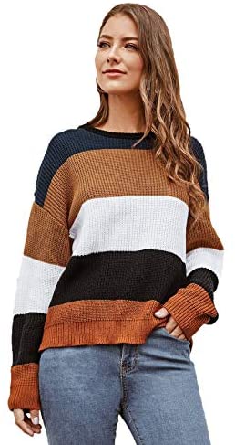 Material: 100% Acrylic. Soft and Stretchy. Features: Fabric has some stretch. Long sleeve, round neck, striped pullovers sweater with colorblock and tie back design. This stretchy striped sweater with tie back design makes you more fashion and trendy. Pair with...
