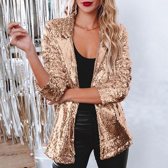 Blazer for Women Shimmer Jacket Casual Long Sleeve Glitter Party Shiny Lapel Coat Rave Lightweight Blazer Coat(S-3XL)