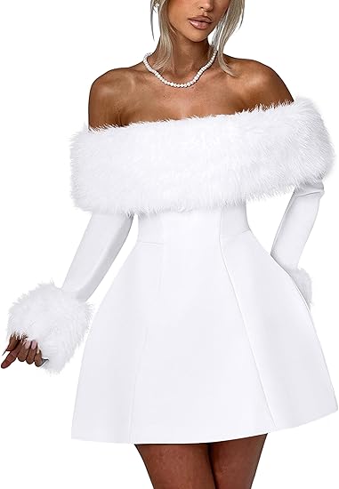 Women's Off Shoulder Long Sleeve Fur Trim A-Line Party Club Mini Dress