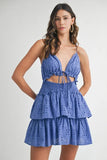 The lace eyelet ruffle mini dress with front cutout is a stylish and romantic choice for a special occasion. The lace eyelet detailing adds an elegant and feminine touch to the dress, while the ruffle accents enhance its charm. The front cutout adds a modern and flirty element to the design. Perfect for a date night or a summer event, this dress exudes sophistication and is sure to make a statement. Pair it with heels and delicate jewelry to complete the look and showcase your style. Enjoy the glamour and allure of this trendy lace mini dress!