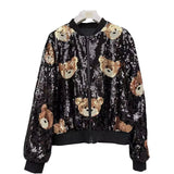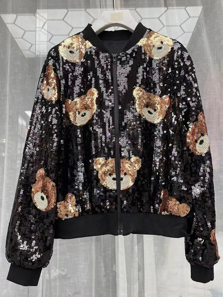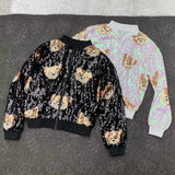 Cartoon Bear Sequined Long Sleeve Loose Baseball Collar Zipper Coat Women's 2023 Spring New Jacket
