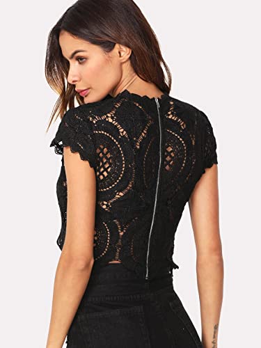 Women's See Through Mesh Lace Crop Top Crochet Short Sleeve Embroidered Tops