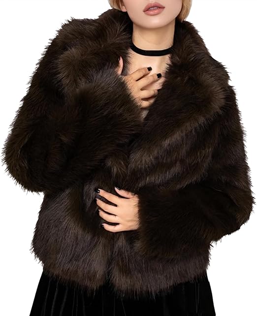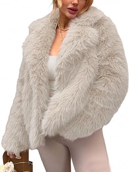 • Material: Fashion open front shaggy short coat made of quality faux fur fabric is mid-weight, gorgeous and elegant. The fluffy faux fur jacket is paired with a smooth lining, allowing you to stand out in the crowd and stay warm in cold winter.