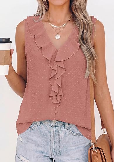 - Trendy Design: Sleeveless tops for women combine style with feminine details. The flattering V-neckline helps elongate your silhouette, while the eye-catching ruffle trim cascades down the front, adding a playful and elegant touch