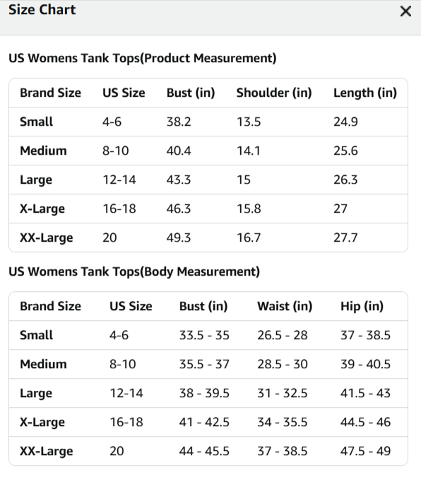 - Size Tips: S=US 4-6, M=US 8-10, L=US 12-14, XL=US 16-18, XXL=US 20. Made from a soft and lightweight fabric, tank tops for women provide breathable comfort for spring and summer, making them a great choice for all-day wear